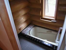 浴室も、もちろんシーダー。窓からは、うっそうとした森の景色が、眺められます |