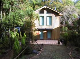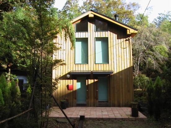 外観とアプローチ コンパクトなワンルームタイプの別荘。カナダでは、最も一般的な別荘のスタイルで、ここを基地にして、家族がアウトドアへ出かけてゆく。外壁は、レッドシーダーのサイディングを使用し、森に囲まれた景観との調和を図っている。正面テラスは、室内の土間と一体になっており、色々なシーンで活躍している |
