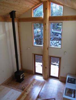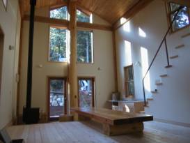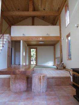 縦長の大きな空間。南面なので、最高も十分採れています。シーダーの通し柱で囲まれた空間は森のようです |