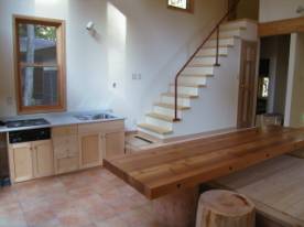 土間は、キッチンとしても活躍します。段差を利用して、3.5mのシーダーテーブルはいろんなバリエーションが楽しめます |