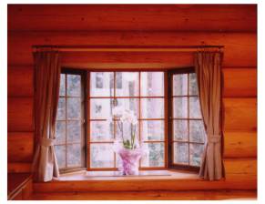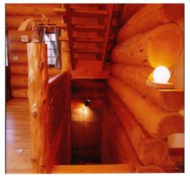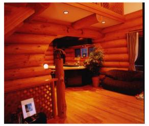 ダイニングは、オープンスタイルのカウンターキッチン。ログビームには、インディアンの彫刻が彫られています。家の守り神 |