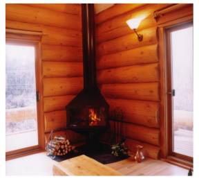 コーナー用の薪ストーブ。これ一台で家中あたたかです。火を囲んでのくつろぎのひと時は、最高だそうです |