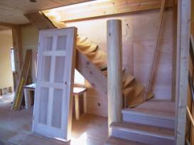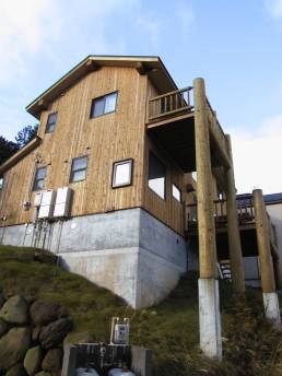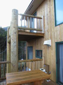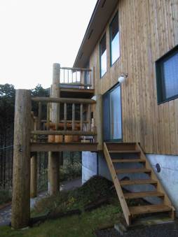 階段もシーダー加工。ポストの横には、薪ストーブを設置する予定 |
