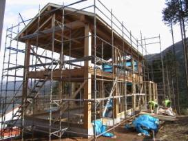 レッドシーダーの軸組みは、25cm角の通し柱を使用。屋根を葺いて、これから外壁に取り掛かります |