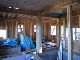 工事中の室内。外壁の構造用合板が張られ 構造的には、これで十分な段階です。これから窓をとりつけてゆきます |